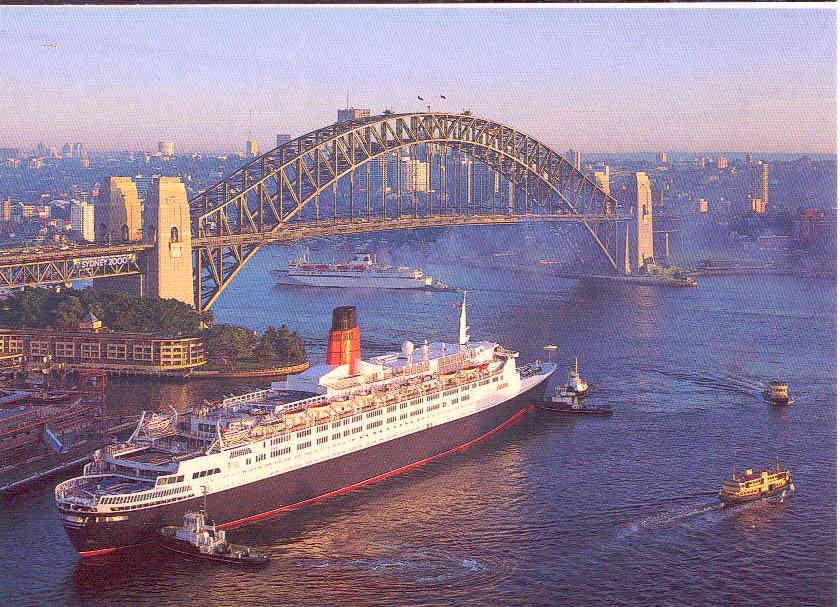 QE2 arriving at Sydney Cove Passenger Terminal while the "Russ" passes beneath Sydney Harbour Bridge